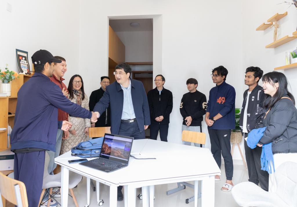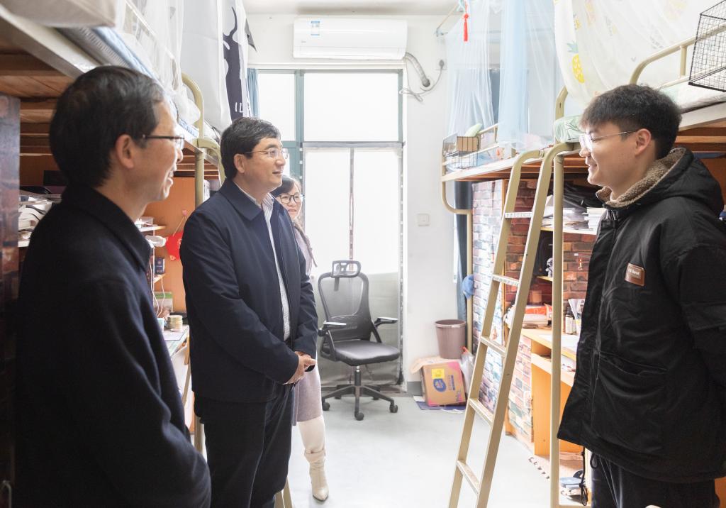 “老家是哪里的呀?为什么选择留校过年?假期生活怎么安排?”在学生宿舍,朱坚一行与学生亲切交谈,详细了解留校学子的在校学习生活情况,询问同学们在学习、生活上的需求和对学校工作的意见和建议,并鼓励同学们做好假期规划,劳逸结合,合理安排寒假生活和学习,常常与家人保持联系。来到留学生公寓,朱坚、项凤日热情地与国际学生进行交流,一一询问他们的国籍、专业、年级等信息,细致地了解留学生们在校的学习和生活感受,建议同学们通过亲历中国传统节日,深入了解中国文化,从他们的视角讲好中国故事,传播中国声音。